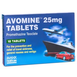Avomine 25mg motion sickness tablets contain the active ingredient 'promethazine teoclate'. This works to prevent any nausea associated with travel sickness. Avomine can also be prescribed to combat vertigo.