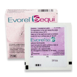 Evorel Sequi is a hormonal replacement therapy (HRT), used to effectively relieve the symptoms of menopause. Altogether there are two forms of patches; Evorel 50, containing the ingredient estradiol hemihydrate, and Evorel Conti, containing the ingredients estradiol and norethisterone. These ingredients are forms of oestrogen and progesterone (main female sex hormones). Distressing symptoms of menopause, such as night sweats, hot flashes, and irregular periods can be successfully treated by using the Evorel Sequi patch.