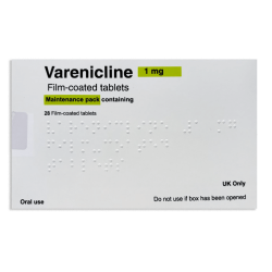 | Varenicline | Varenicline | 12 weeks | Start by taking one white tablet once a day for 3 days, then increase the dose as instructed until the maximum dose of one blue tablet twice daily. |