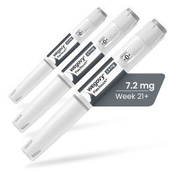The 7.2 mg Wegovy dose is administered through three 2.4 mg pens, injected one after another, once weekly. Leave at least 5 cm between injections and use a new needle for each one. Please note that a single 7.2 mg pen may be sent instead, in which case you will only need to inject yourself once weekly.